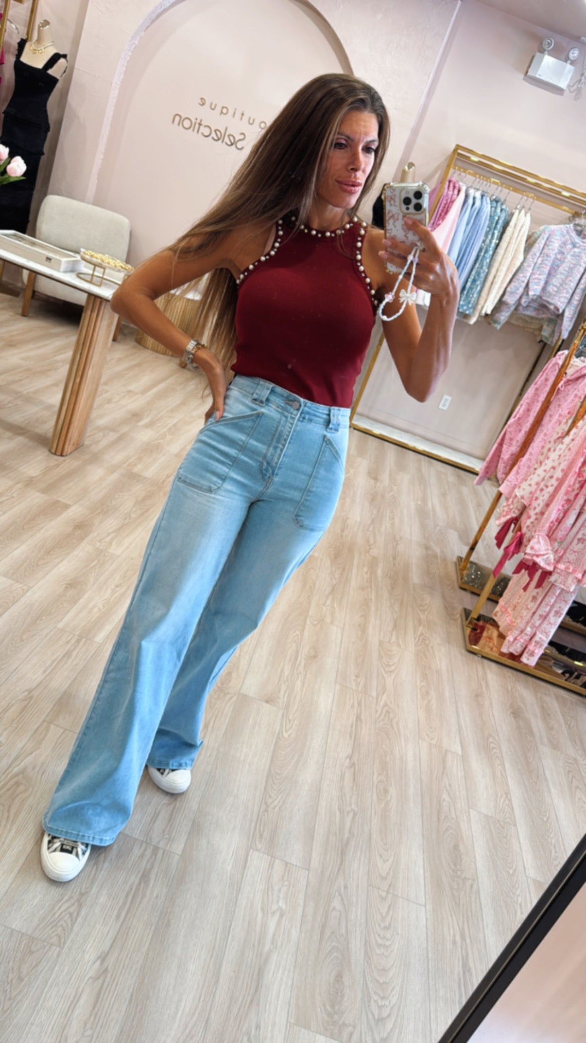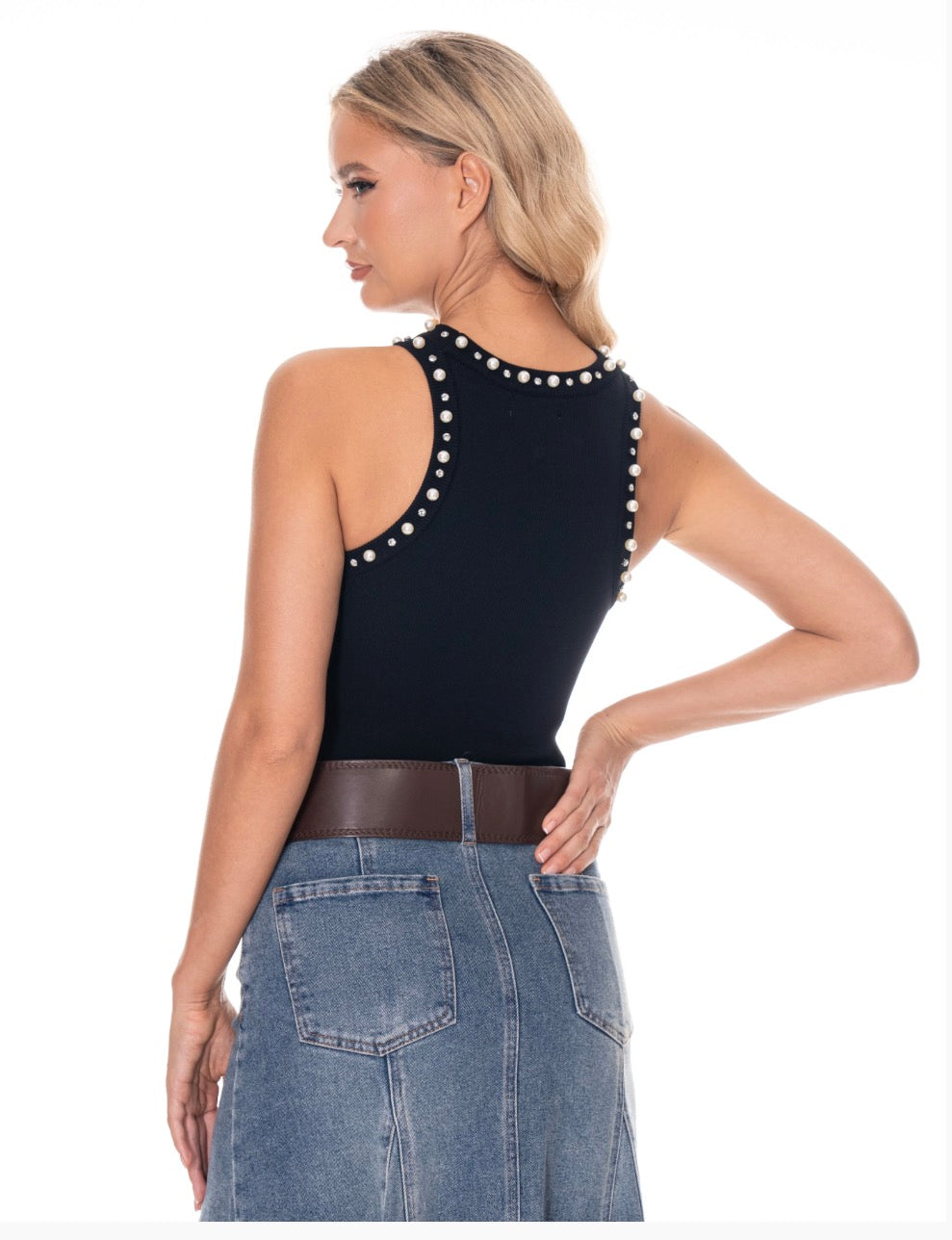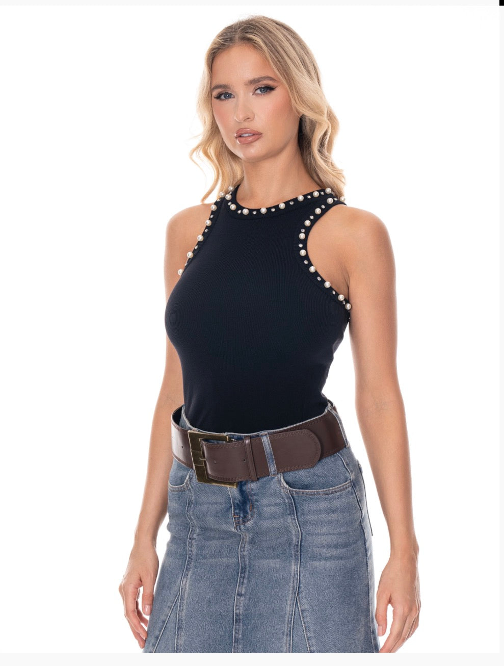 Luxurious ribbed top camisole available in black, white or burgundy. Featuring a pearl and crystal detailing.