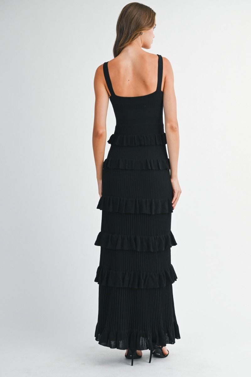 Black fine knitted , layered ruffles maxi gown dress. featuring bow design ribbed delicate knit. This gorgeous dress is versatile, form featuring and can be easily worn for both chic and casual occasions.