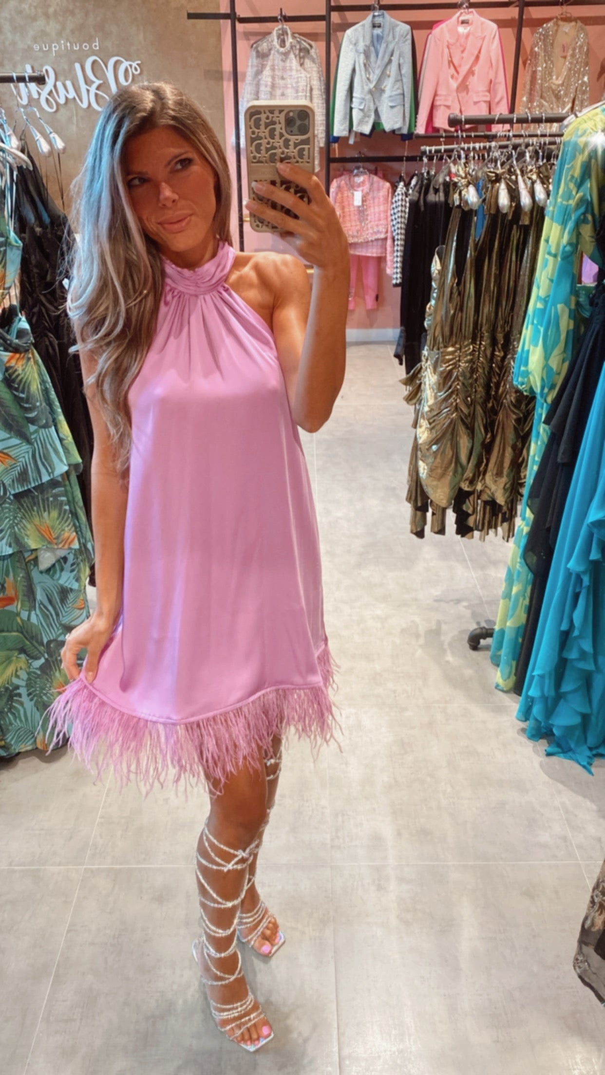 Purple lilac loose fitted trapeze knee length dress. Featuring a row of ostrich feathers, high quality satin that is lined.