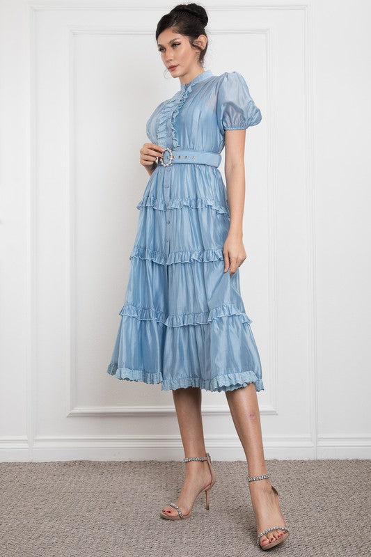 Pearly chiffon satin short sleeves belted midi dress. A formal to casual style dress, buttoned neckline, round collar, puff sleeves with ruffle teared design.