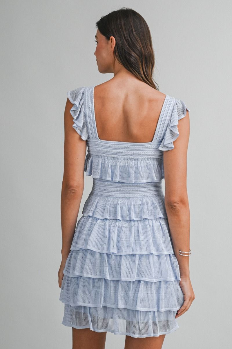 Intricate fine quality satin crochet summer mini dress, in light blue or vanilla white. The dress sits above the knee and features ribbon ruffle straps and flattering ruffle layers. The dress is fully lined and fitted. Beautiful a casual or formal occasion, a holiday outfit or a day event.